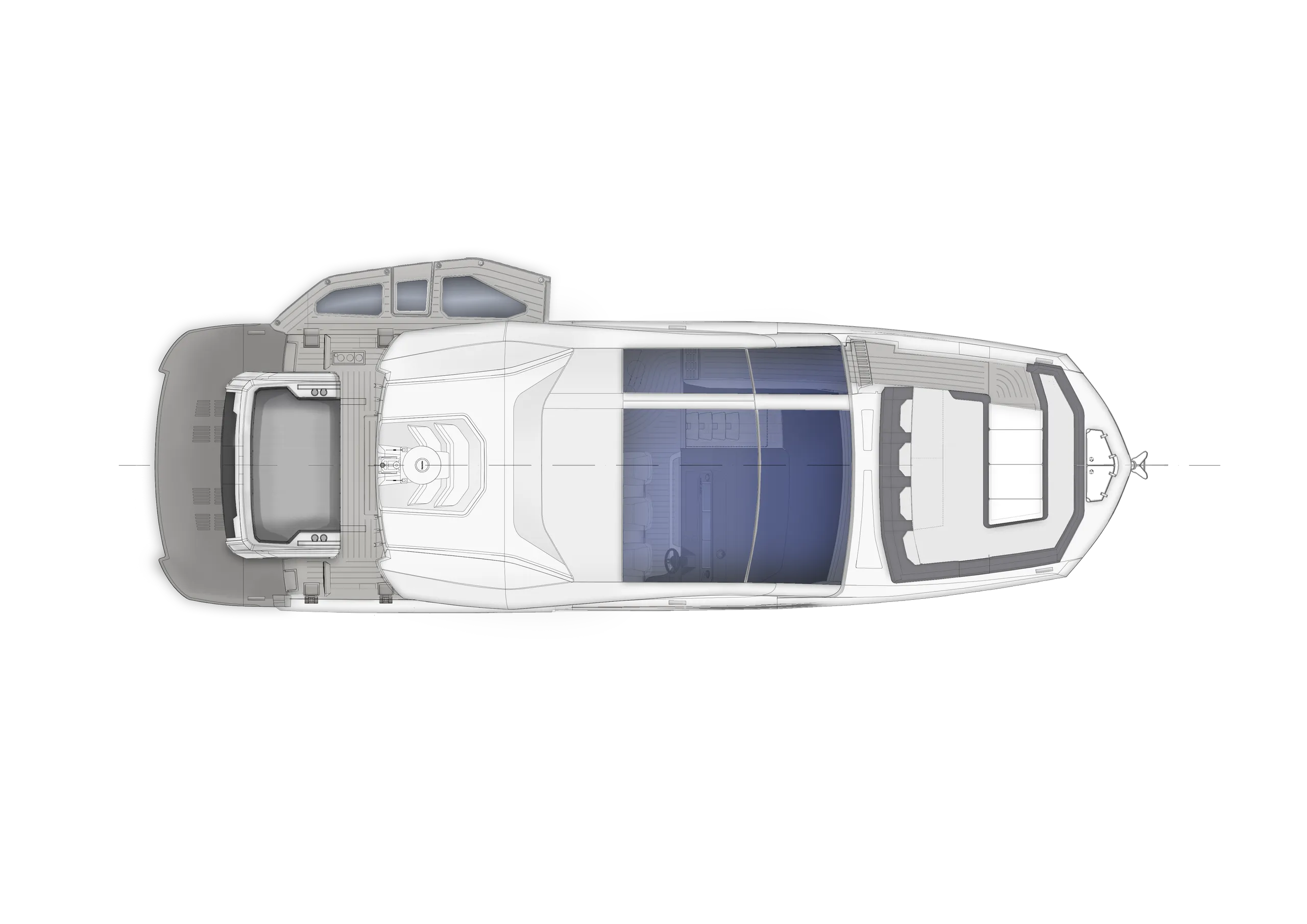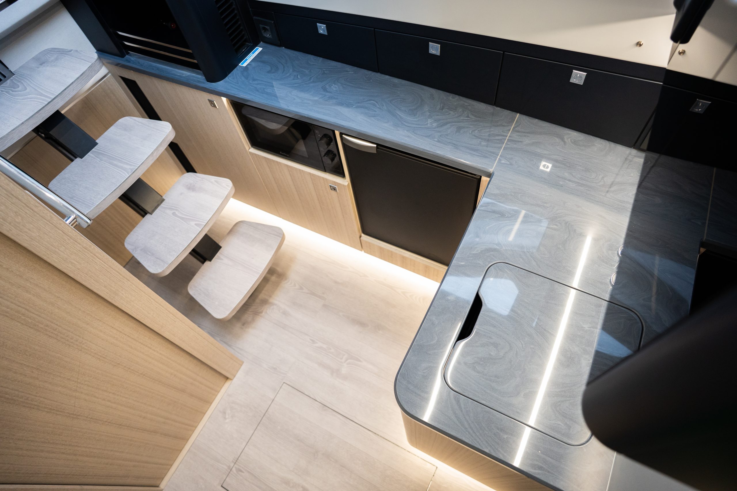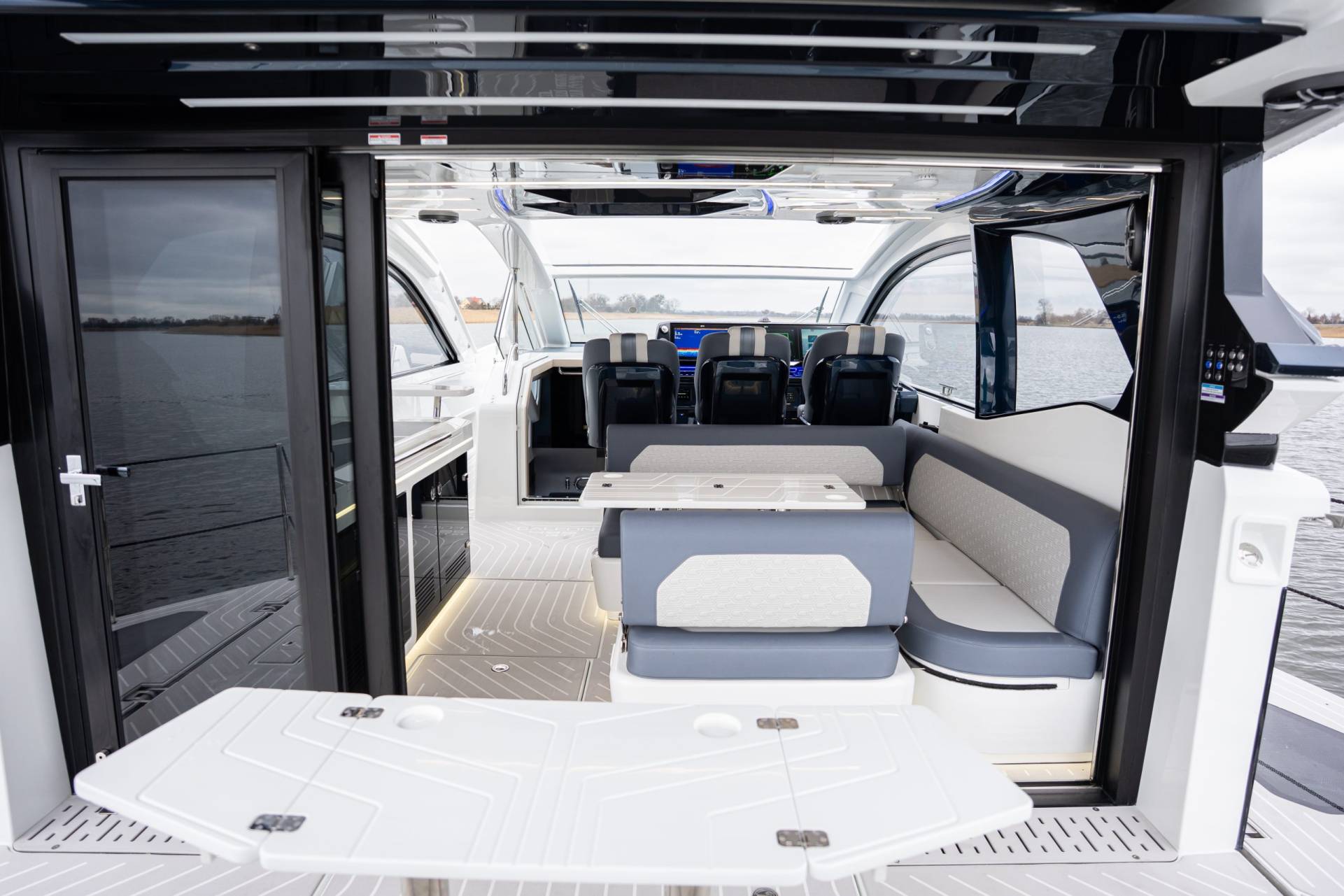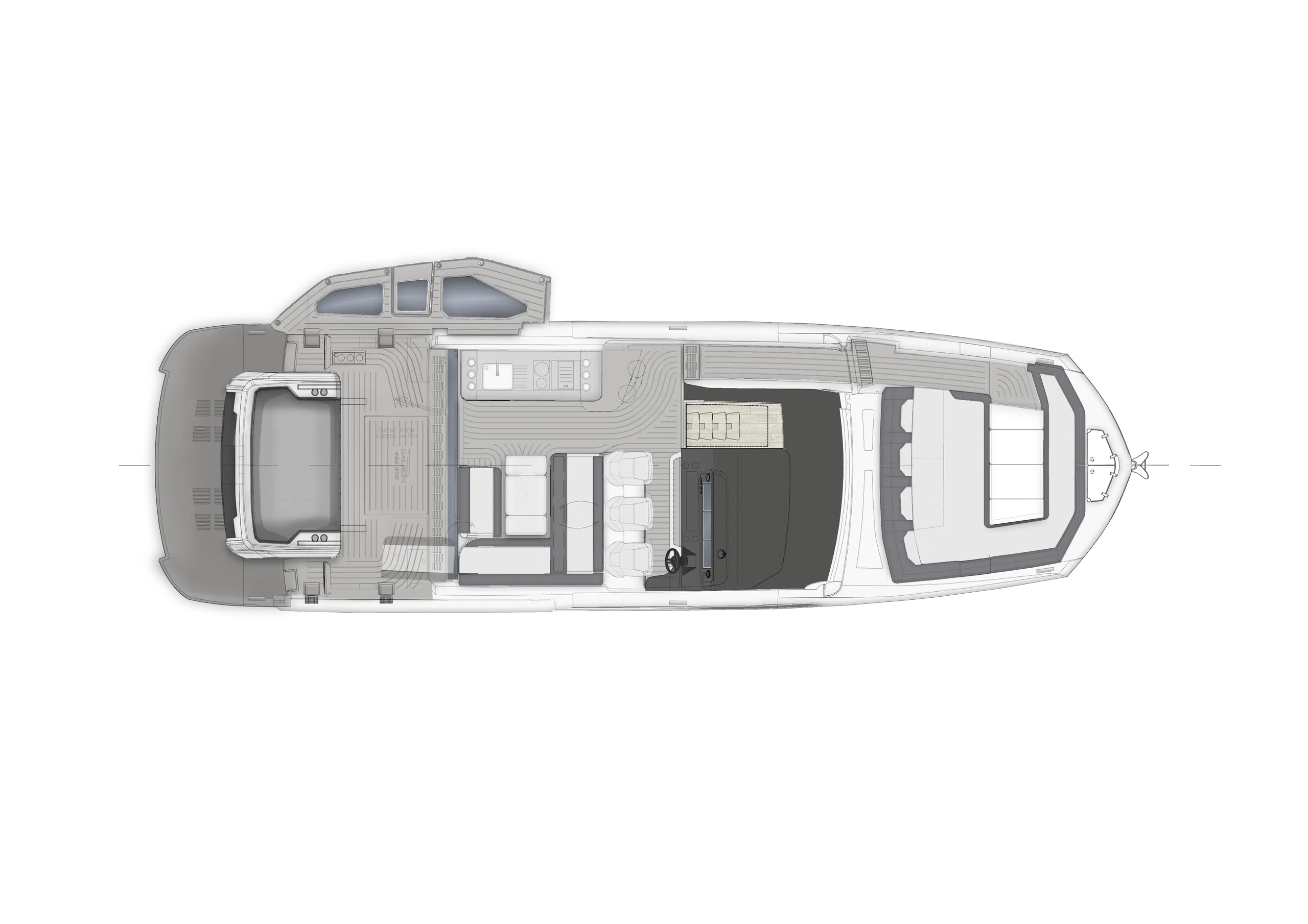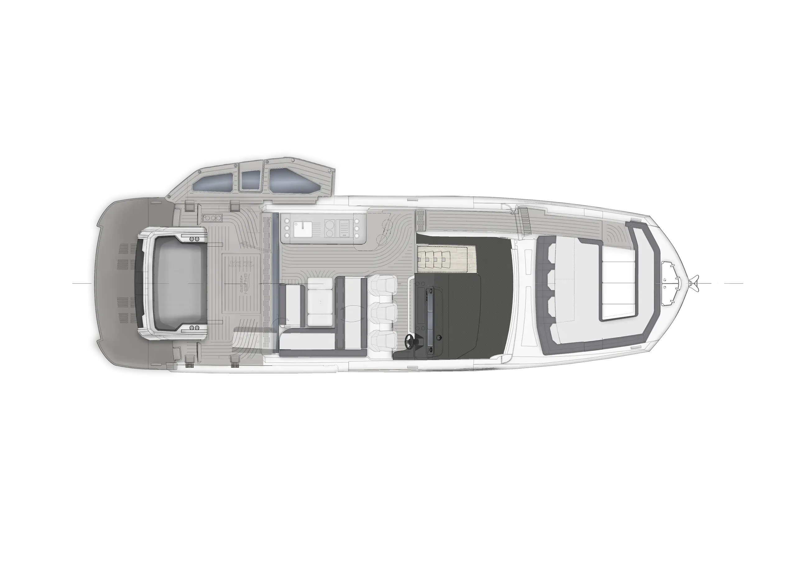 The cockpit is a highlight of versatility, featuring transformable seating that converts into a sunpad and hides a compact garage below—perfect for a Zodiac dinghy or water toys. A hydraulic swim platform provides easy sea access and doubles as a lift. The Beach Mode fold-down balconies further expand the deck space, creating an open, social atmosphere at anchor.