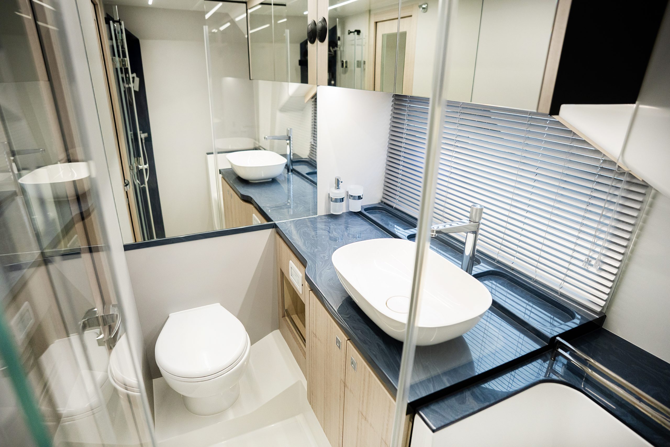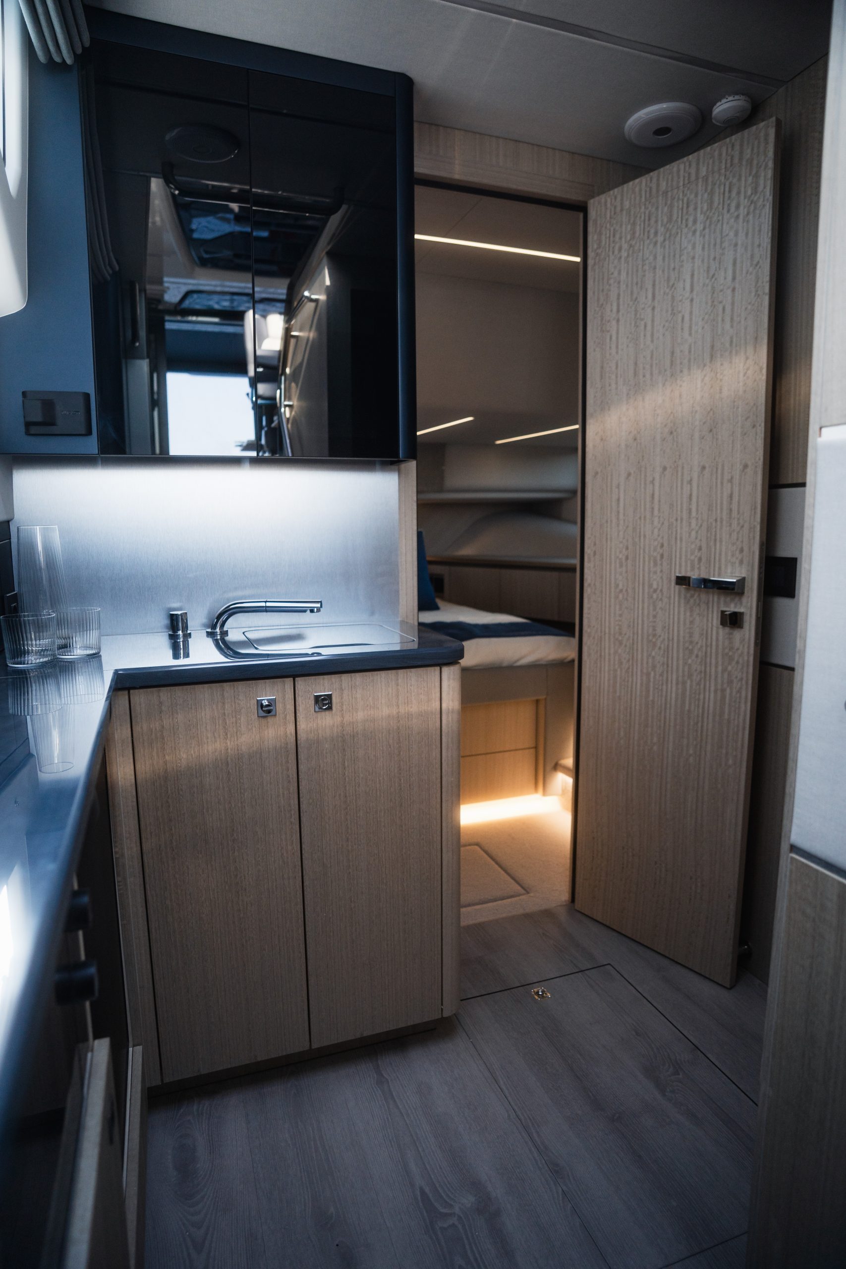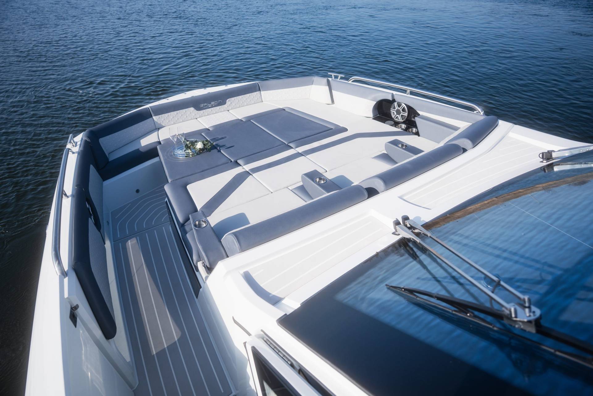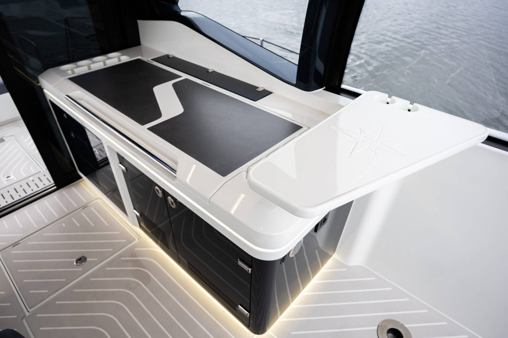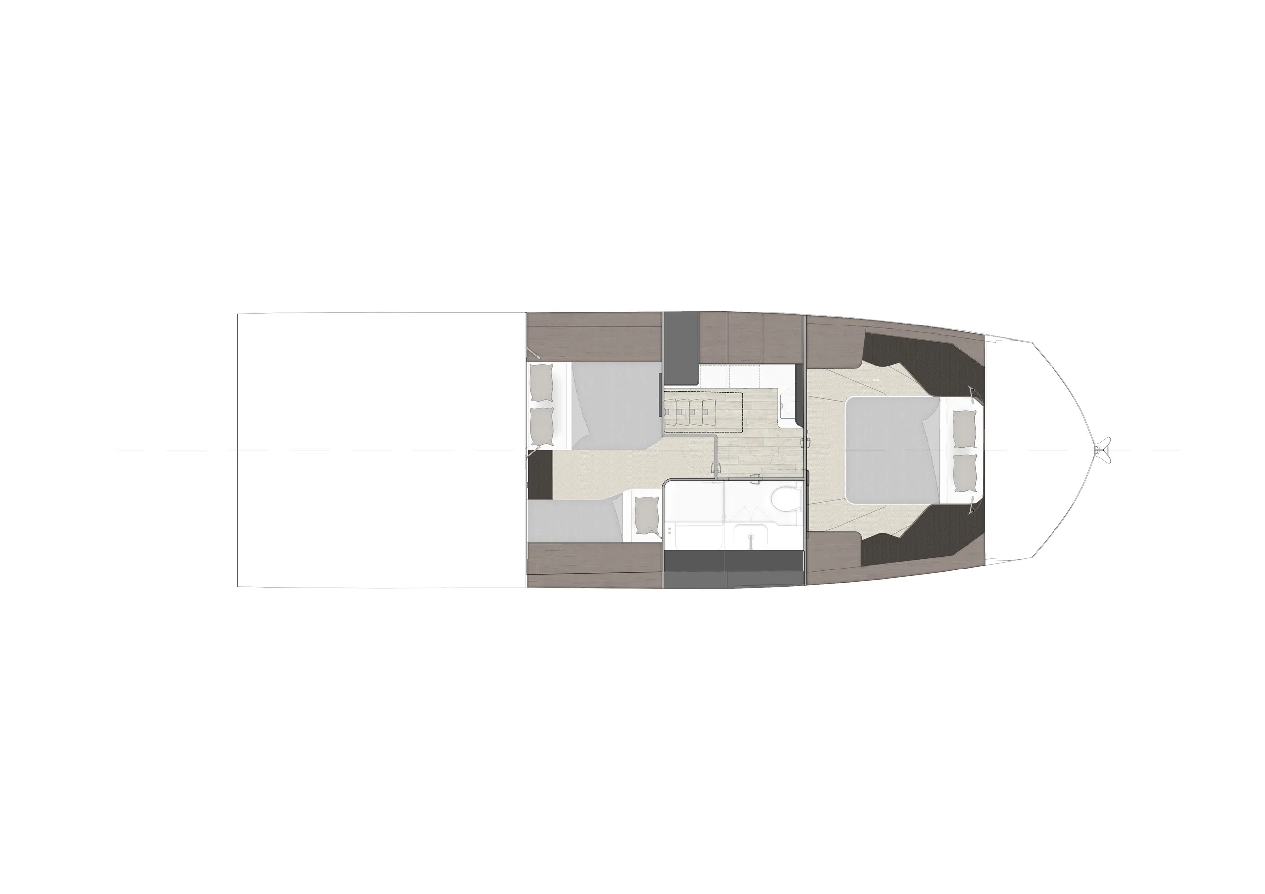 The cockpit is a highlight of versatility, featuring transformable seating that converts into a sunpad and hides a compact garage below—perfect for a Zodiac dinghy or water toys. A hydraulic swim platform provides easy sea access and doubles as a lift. The Beach Mode fold-down balconies further expand the deck space, creating an open, social atmosphere at anchor.